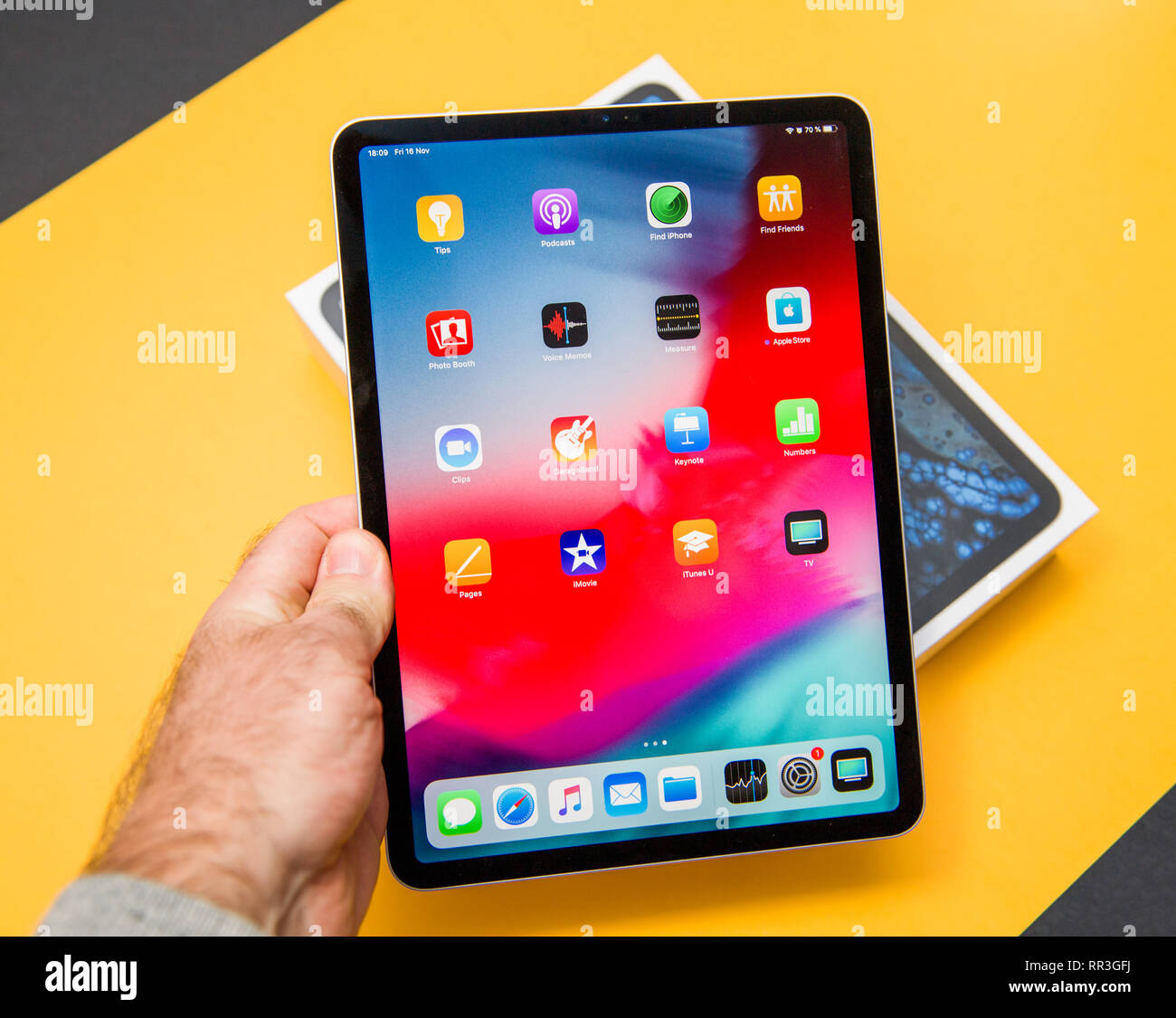 Paris Francia 14 Nov 2018 Hombre Mano Sujetando Unboxing Desempaquetado De Nuevo Ipad Pro Por Apple